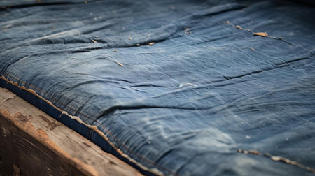 a captivating close-up of a denim bed, highlighting its unique imperfections. the natural grain, cracks, and peeling paint reveal its vintage charm, capturing the essence of a bygone era. ai generated