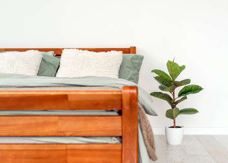 Close-up of a part of wooden bed with linen and pillows and a side cabinet with fresh cut flowers in a vase on top standing against a white wall in a bright bedroom interior. Panorama. Real photo.