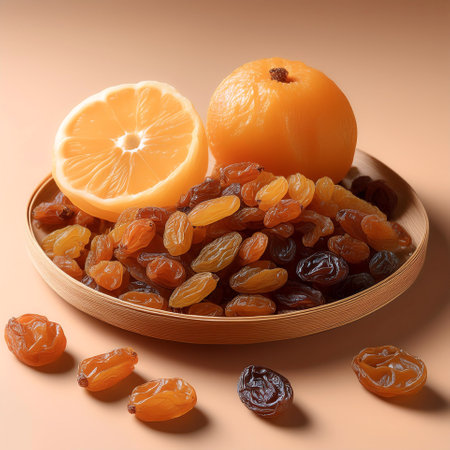 A beautifully arranged bowl of dried fruits sits against a dark background. The warm tones and textures create an inviting atmosphere, perfect for food photography.