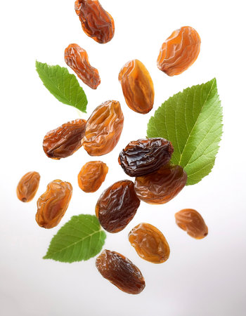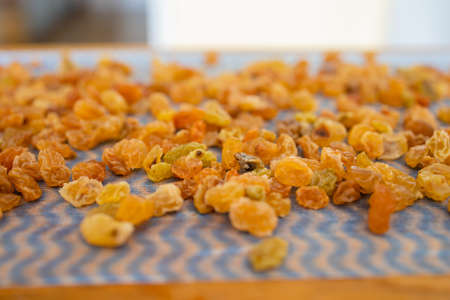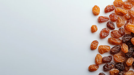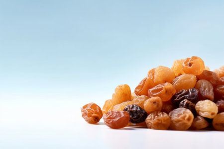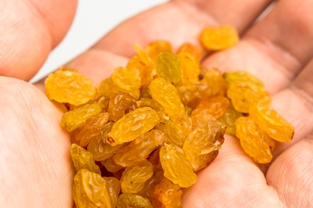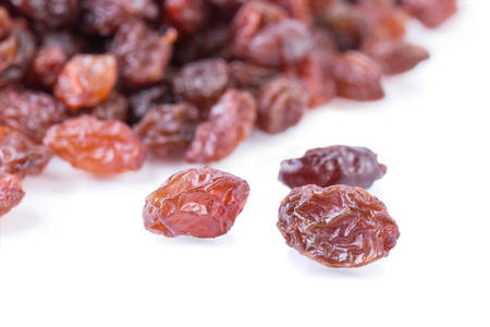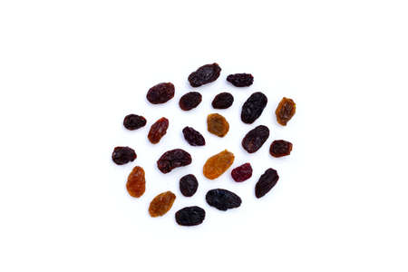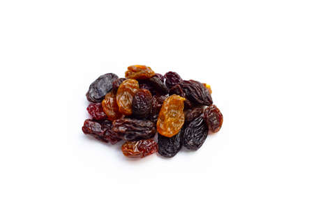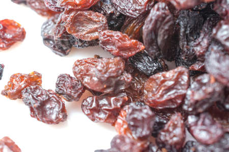 Raisins close-up on a white background. Raisins from different grapes, raisin color mixing
