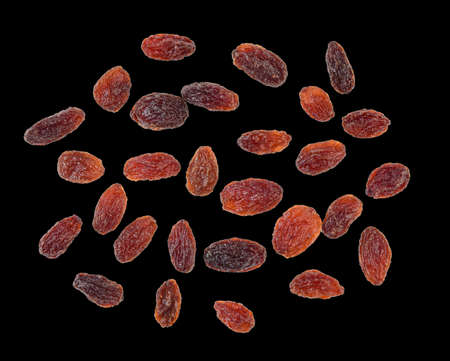 Black raisin isolated on white background with clipping path. Top view with copy space for your text. . Flat lay