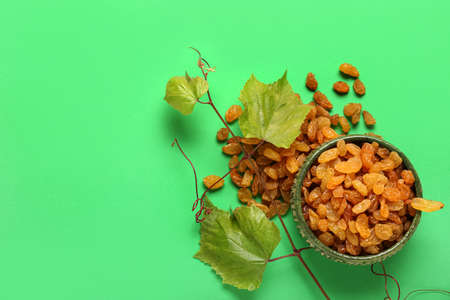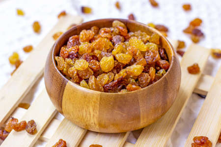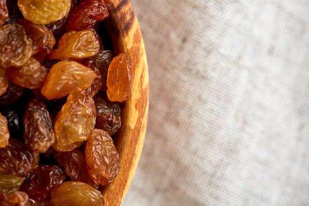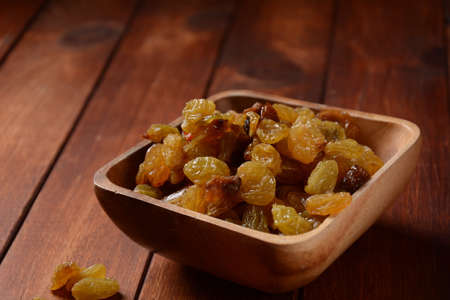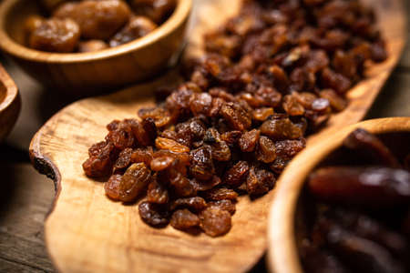 Dried raw raisins in wooden bowl. Natural raisins in a bowl. Bowl with dried raisins.