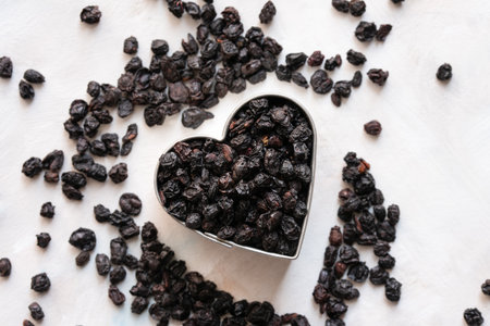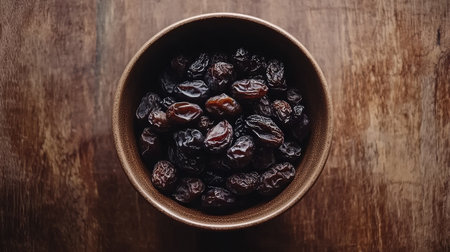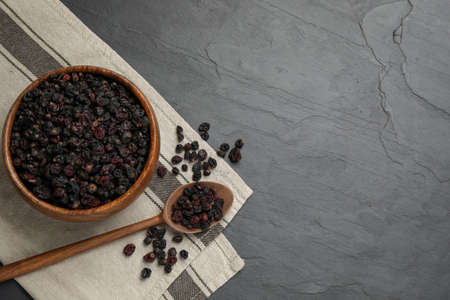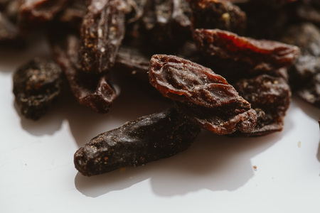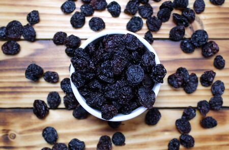 Black raisin or kali kishmish or Zante currant in a white plate on wooden surface in dark Gothic colors to decreases the chance of Dehydration.