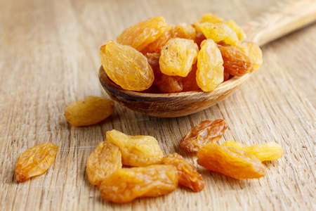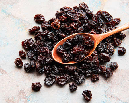 Dried Organic Raisins in a wooden Spoon on Rustic Background. Close-up. Selective Focus. Copy Space.