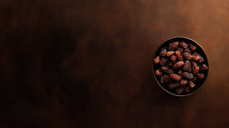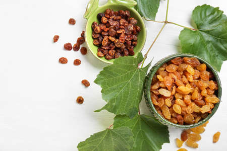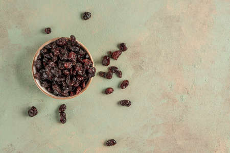 Raisins. Sun-dried grapes in ceramic bowl. superfood Vegetarian food concept. healthy snacks. Top view. Copy space. Empty space for text