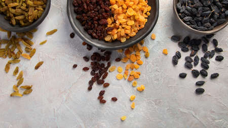 Different types of raisins on light background. Dried Fruits. Top view, flat lay, copy space