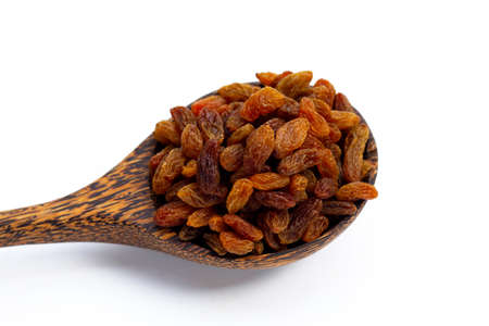 Heap of sweet raisins in wood bowl isolated on white background. Dried grapes pile, top view