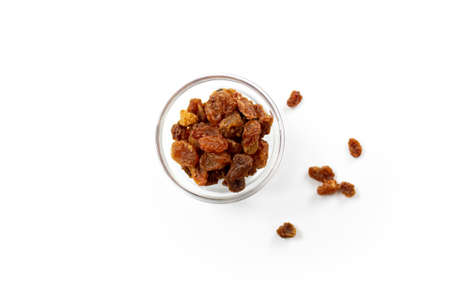 handful of dry raisins in glass bowl on white isolated background, top view.
