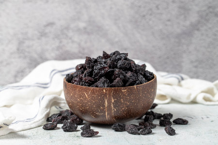Dried black grapes on stone background. Dried grapes in coconut bowl. Nuts varieties. healthy eating. close up