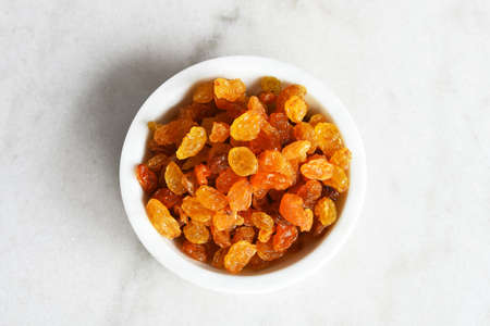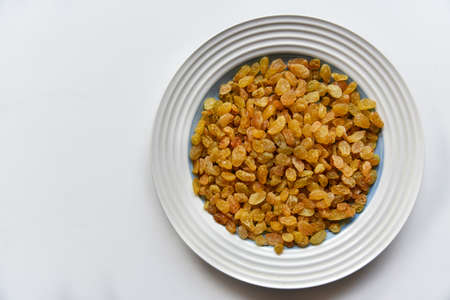 Yellow juicy raisins on a white plate. Vegetarian food. top view.