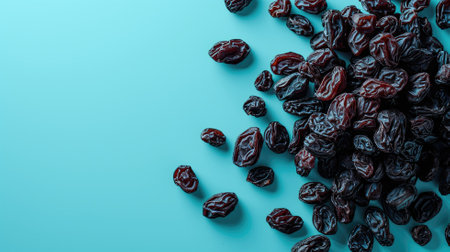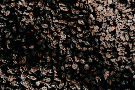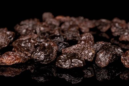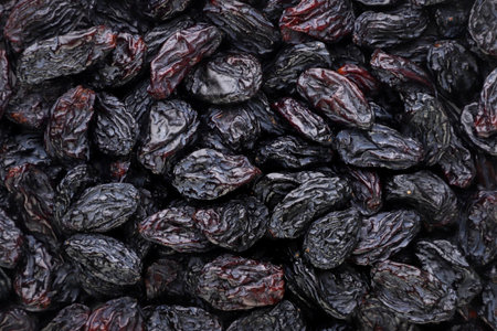 Flat-lay of black dried raisins, top view, close-up, horizontal composition. Texture and background