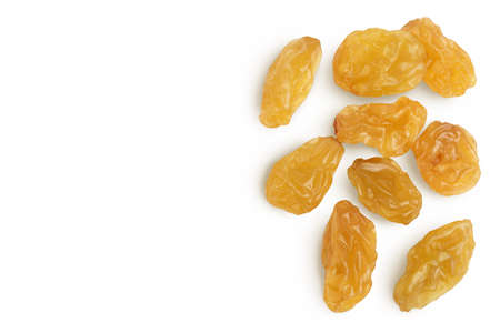 Yellow raisin isolated on white background with clipping path. Top view with copy space for your text. . Flat lay