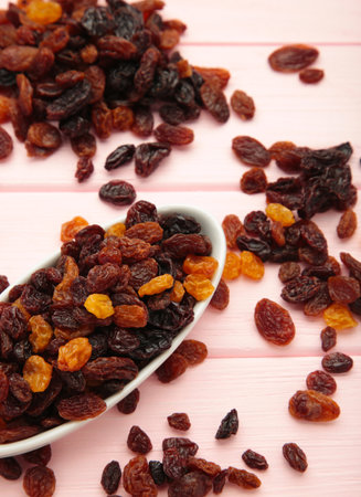 Raisins in white plate on pink wooden background. Vertical photo. Top view