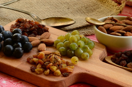 A visually appealing display featuring fresh grapes alongside an assortment of dried fruits and nuts, perfect for healthy snacking and culinary inspiration.