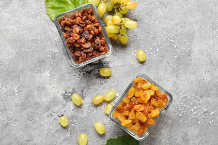 Glass bowls with tasty raisins and ripe grapes on gray background