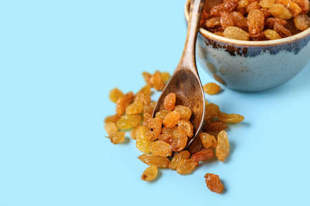 Brown raisins (dried yellow grape) in round wooden bowl on light background.