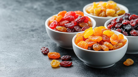 A set of small bowls filled with dried fruits like apricots, raisins, and cranberries.