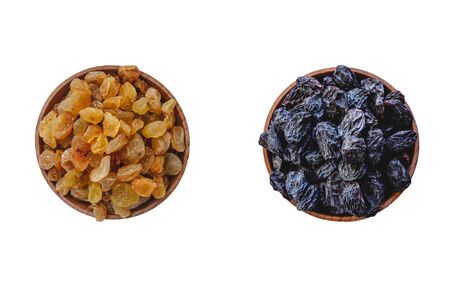 Wooden bowl with light and dark raisins isolated on white background. View from above. Copy space. The concept is natural, eco-friendly.