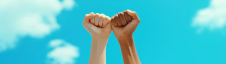 Hands raised in solidarity against blue sky, created with AI