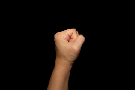 Hand gestures. womans fist stretches up, a symbol of the struggle for rights and dissent,