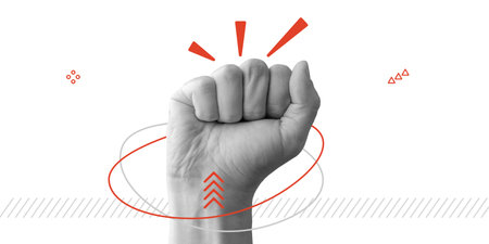 Power, strength, solidarity, determination, and activism. A closed fist raised upward with red accent lines. Red lines and dynamic shapes emphasize action and determination. Minimalist art collage