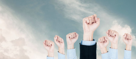Fists of people raised in the air with sky and sunlight background.