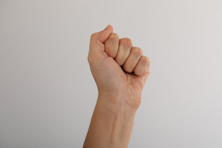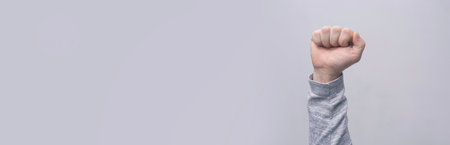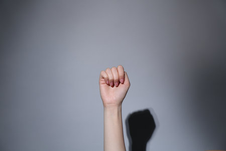 Hand gestures. womans fist stretches up, a symbol of the struggle for rights and dissent. Hand gestures, light grey background