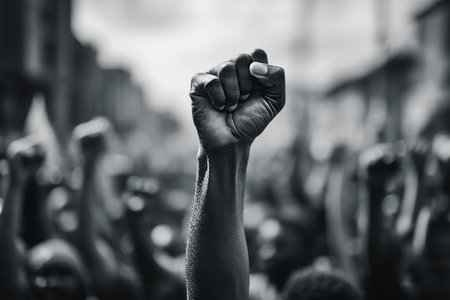 Powerful close up of raised fists symbolizing strength and activism at a civil rights march