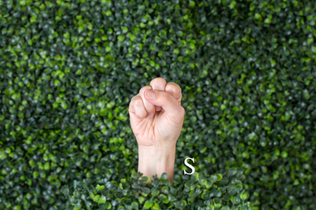 Sign Language Letter S made with hand against green plant background