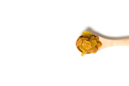 Raisin in wooden spoons, close-up. Dried white and black grapes fruit. Gray background, top view, copy space.