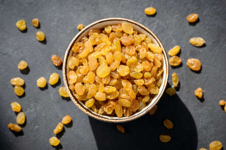 Golden raisins or sultana in bowl on black background, table top view. Dried fruit, healthy snack food