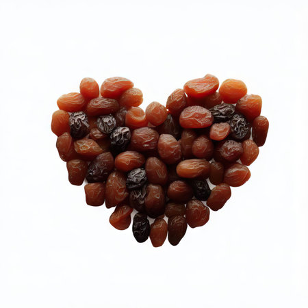 Dried apricots and raisins are laid out in the form of two hearts on a beige background. Healthy eating. Food for heart health. Sweets for pregnant women. Vegan food. View from above. Valentines Day.