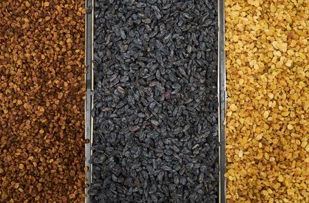 Raisin texture background, close-up. Dried colorful raisins, top view