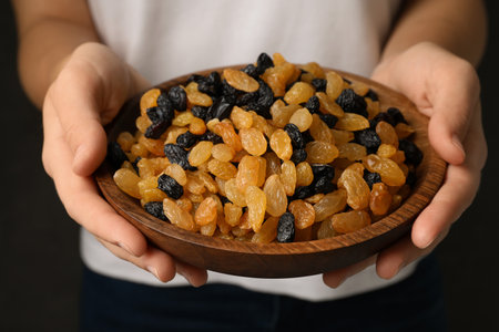 Dark and golden raisins are cascading into a handcrafted ceramic bowl, which rests on a dark stone countertop with scattered raisins.