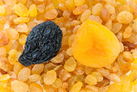 A close-up of dried fruits, a mix of apricots, peaches, and raisins.