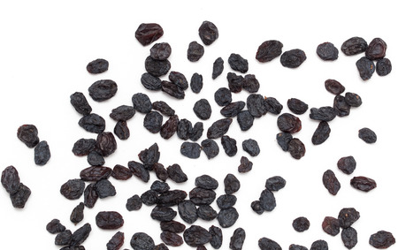 Heap of black raisins on light gray background. Top view, copy space. Dried grapes fruit.