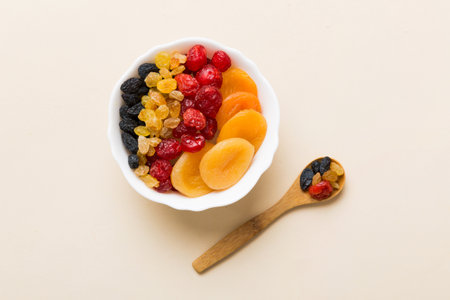 A bowl filled with dried fruits sits on a neutral surface, creating a minimalist aesthetic. The scene features warm tones, highlighting the texture and color of the fruit.