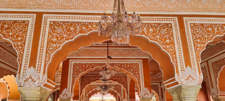 The City Palace at Jaipur, capital city of Rajasthan, India. Architectural details with scenic dramatic sky at sunset.