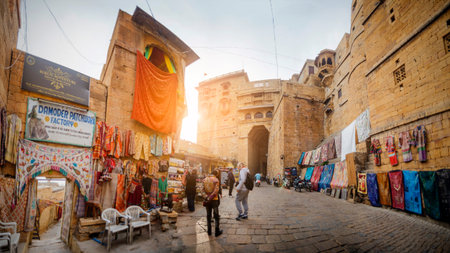 Jaisalmer, Rajasthan, India, Jan 14 2020: Tourists walk near the fort. Jaisalmer Fort also known as the Golden Fort is a UNESCO World Heritage site.