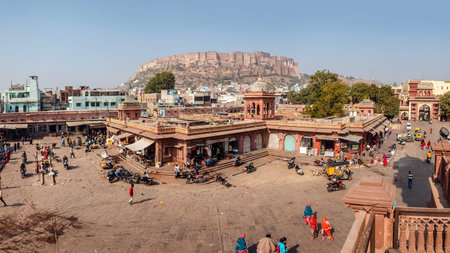 Panoramic view of Sun city Jodhpur also known as 'Blue City' due to the vivid blue-painted Brahmin houses from balcony of Mehrangarh Fort, Rajasthan, India.