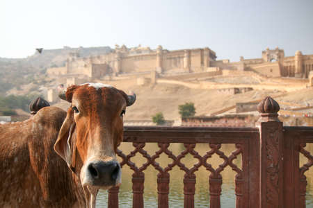 A cow posing in front of the famous amer fort in Rajasthan India