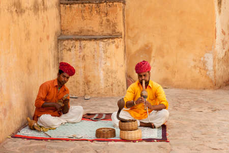 JAIPUR INDIA APRIL 22 2015: A snake charmer is playing the flute for the cobra sitting by the wall in the Fort Amber on April 22 2015 in Jaipur India.