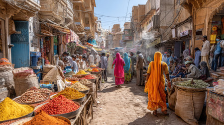 A lively street market in India filled with colorful spices and local vendors engaging with customers. The bustling atmosphere captures a rich cultural experience.