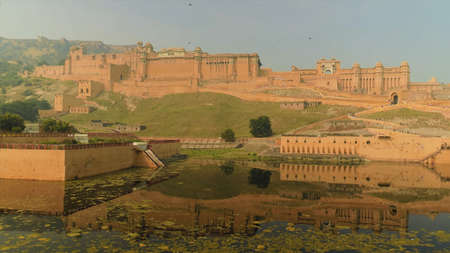 Amber Fort illuminated by warm light of the rising sun and reflected in the lake. Famous Rajasthan landmark located nearby Jaipur city in north-western India.