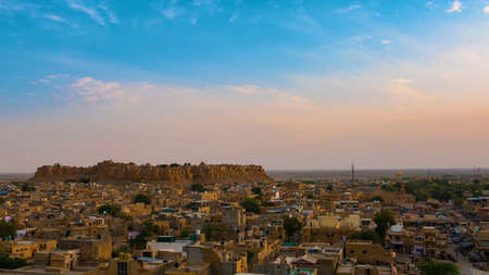 Jaisalmer cityscape at dusk. The majestic fort dominating the city. Scenic travel destination and famous tourist attraction in the Thar desert, Rajasthan, India.