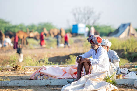 PUSHKAR, INDIA - NOVEMBER 14, 2018: Indian man in the desert Thar during Pushkar Camel Mela near holy city Pushkar, Rajasthan, India. This fair is the largest camel trading fair in the world.