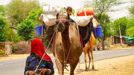 06 May 2021- Reengus, Sikar, India. Indian woman holding a camel with a rope. Great Indian culture concept.