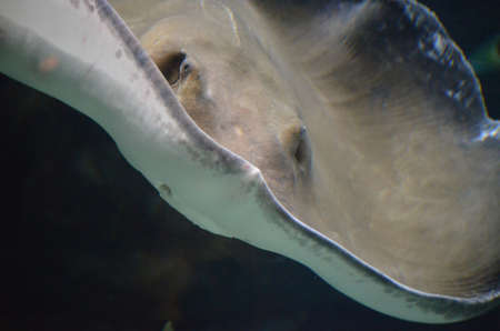 giant freshwater stingray glides gracefully in clear water displaying its broad body and distinctive appearance. This remarkable species captivates with its beauty.