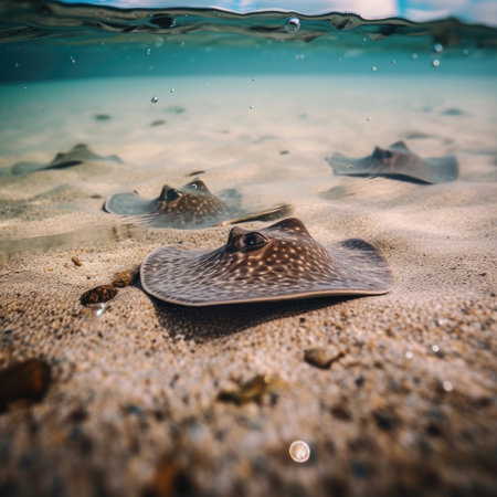 a school of rays swimming together, their flat bodies and flowing tails creating a mesmerizing display, created with generative ai