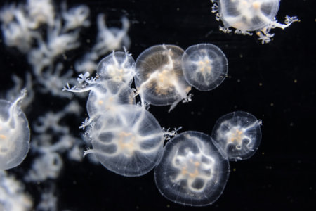 Group of fluorescent jellyfish swimming underwater aquarium pool. The spotted australian jellyfish, Phyllorhiza punctata in aquarium with blue neon light. Theriology, tourism, diving, undersea life.
